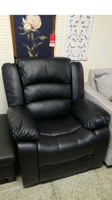 Modern overstuffed recliner made from faux leather with a glossy finish. Manual reclining mechanism that offers full range reclining, as well as ultra-padded armrests and leg rests.