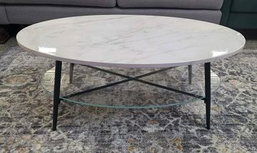 An elegant marble finish topped with veneer paired with a sleek black metal frame. It's unique shape fits seamlessly in front of sofas or beside seating areas.